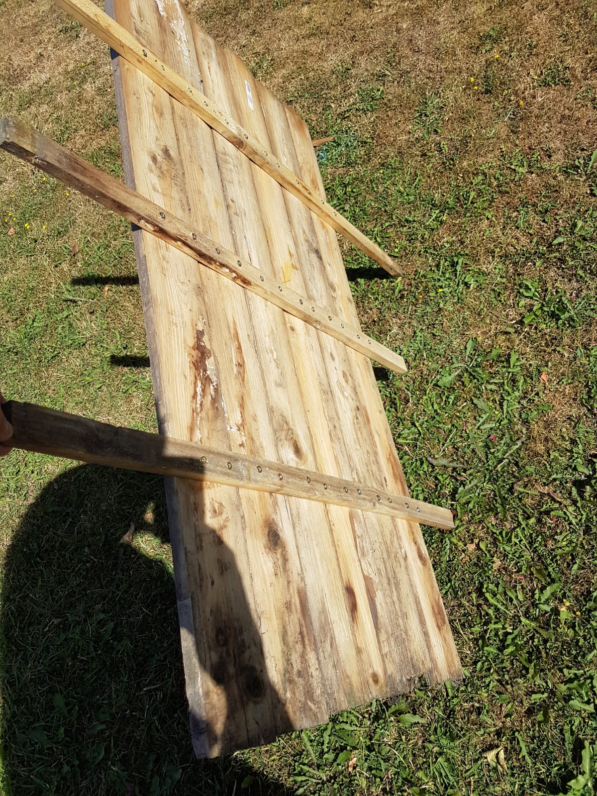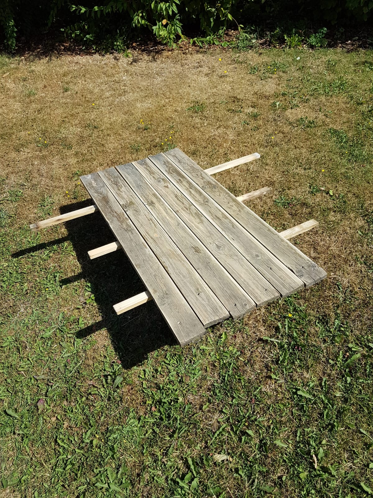 Die verwitterte Seite habe ich als zu bemalende Seite ausgewählt, auf der Rückseite habe ich die Bretter mit dünnen Latten fest verschraubt.