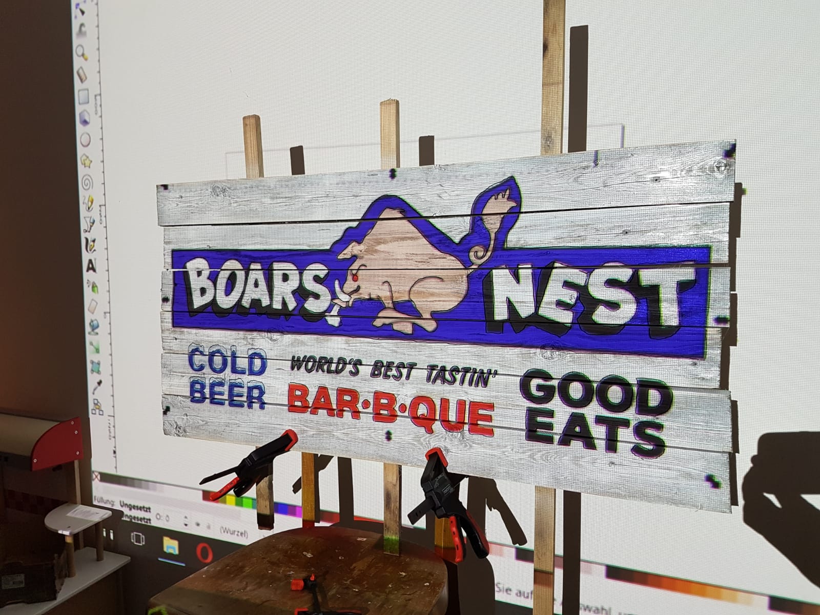 Irgendwann schaute ich die Bilder durch und zack, da war es wieder. Da ich hier mit dem Gedanken spielte eine Außenküche nebst Bar am Haus zu errichten, kam ich auf die Idee, das Boars Nest Schild zu malen und es dort aufzuhängen.