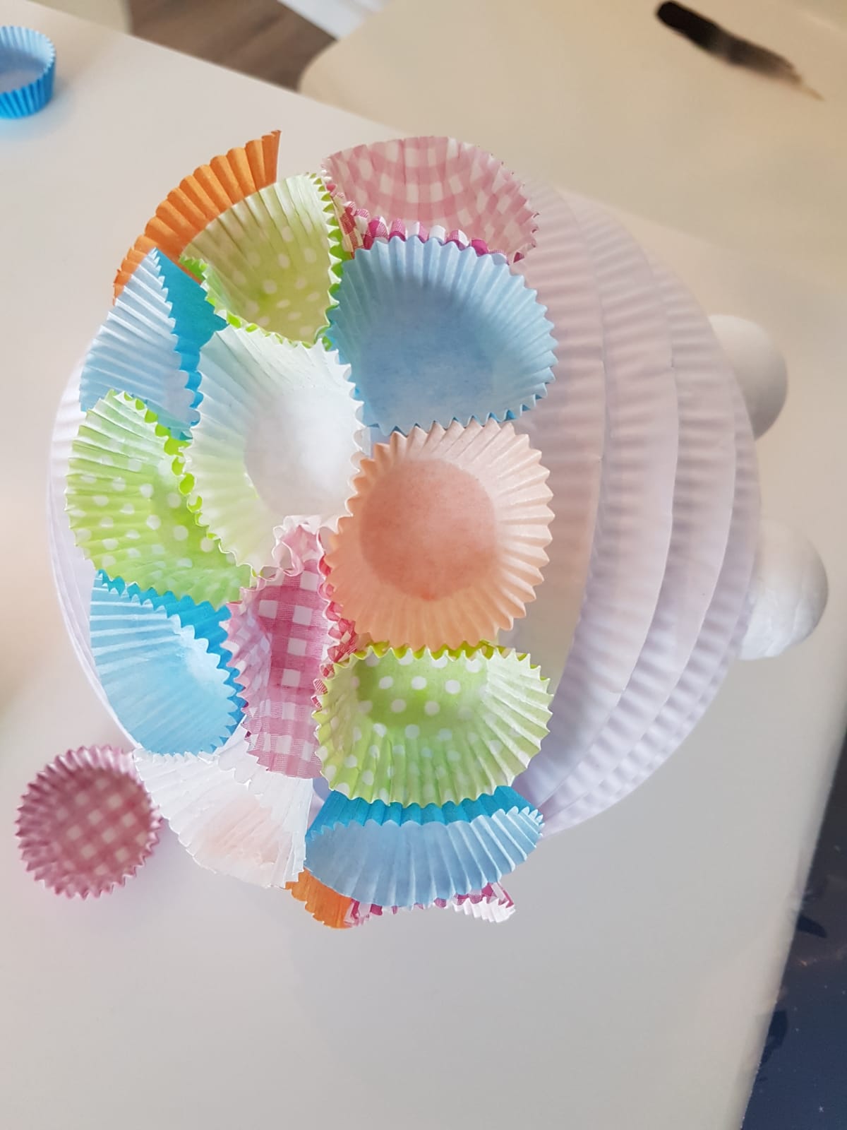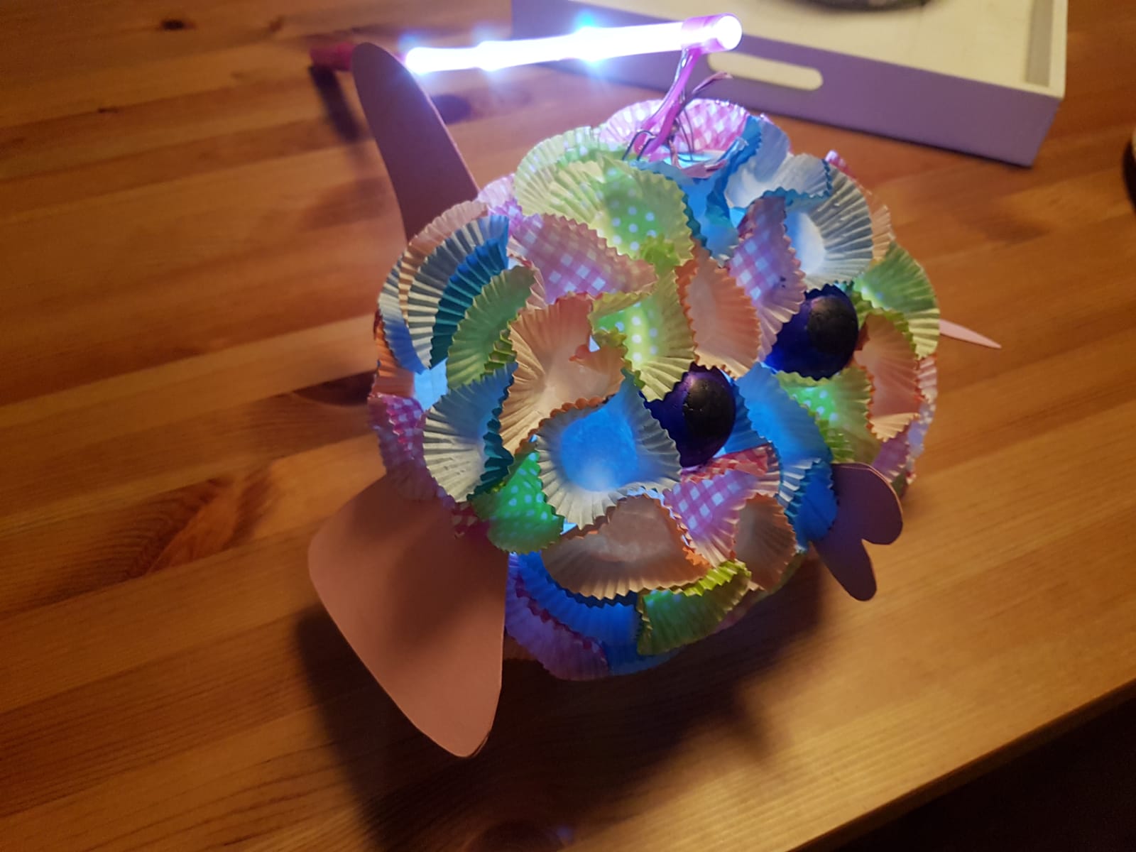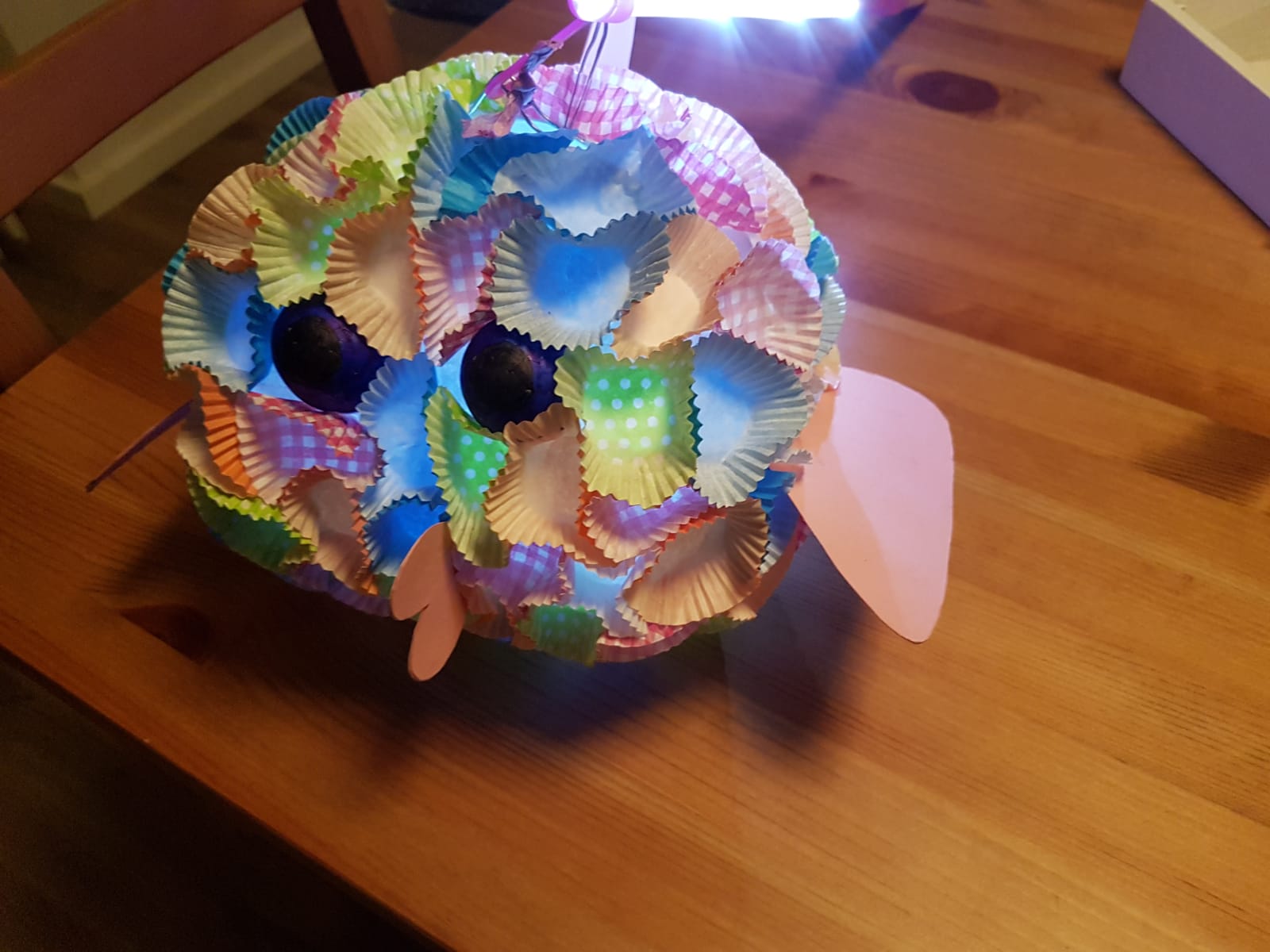 Als erstes habe ich die Augen angeklebt, danach von unten angefangen die Förmchen anzukleben. Das Problem ist, dass man immer erst warten muss, da der Bastelkleber immer erst trocknen muss. Sonst verschiebt sich alles. Das ist der Grund, warum es so lange gedauert hat, bis die Lampe fertig war.