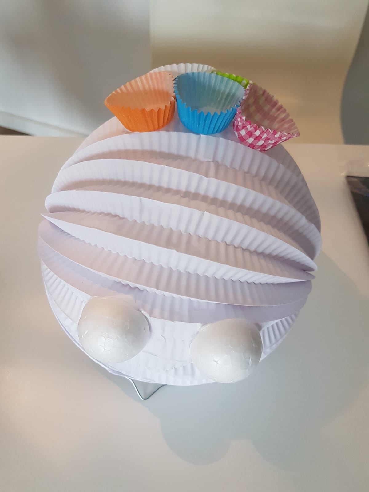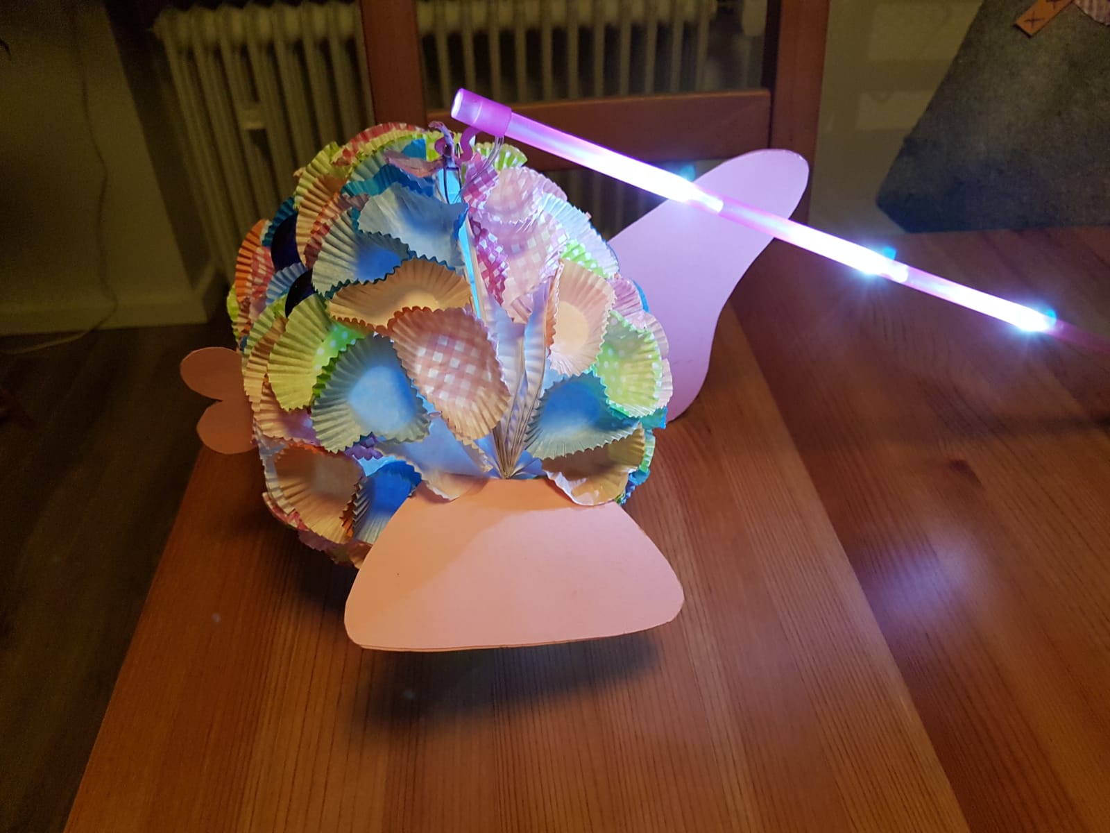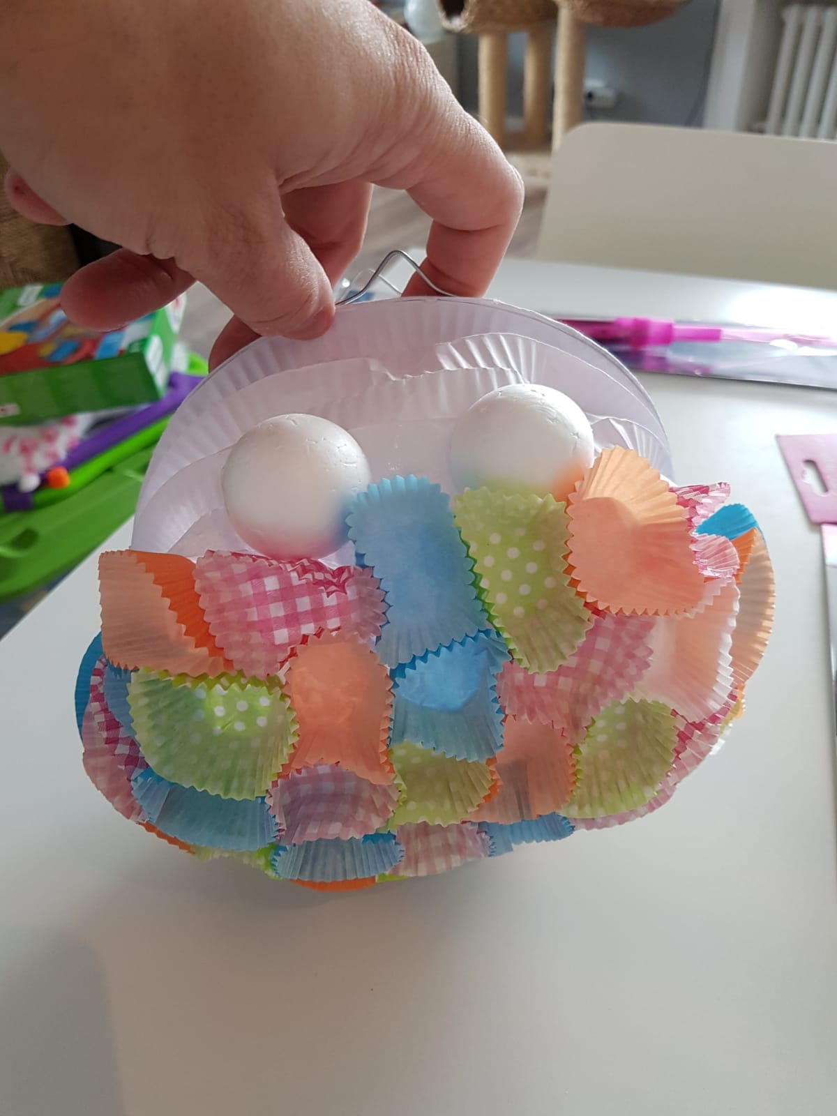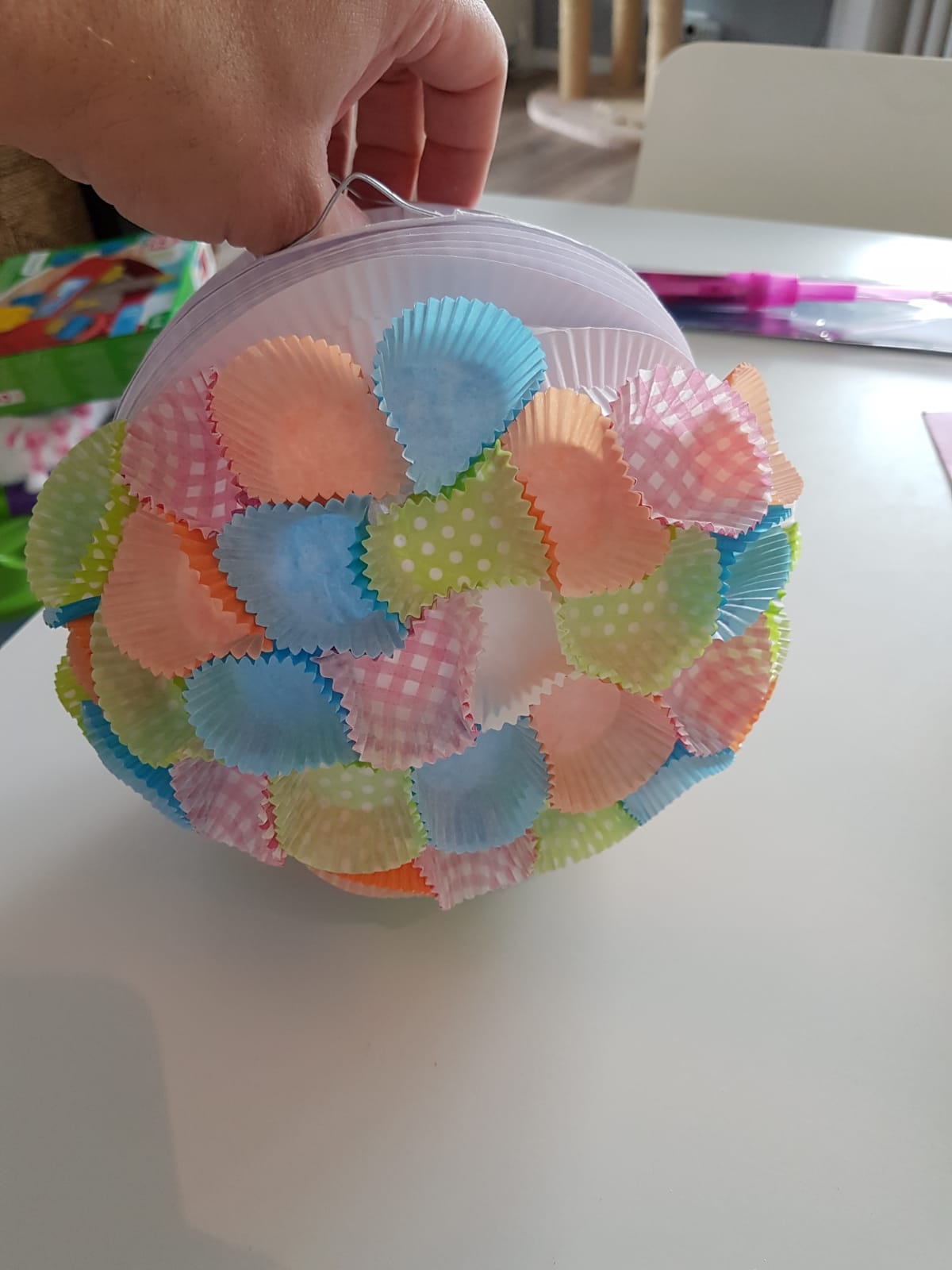 Als erstes habe ich die Augen angeklebt, danach von unten angefangen die Förmchen anzukleben. Das Problem ist, dass man immer erst warten muss, da der Bastelkleber immer erst trocknen muss. Sonst verschiebt sich alles. Das ist der Grund, warum es so lange gedauert hat, bis die Lampe fertig war.