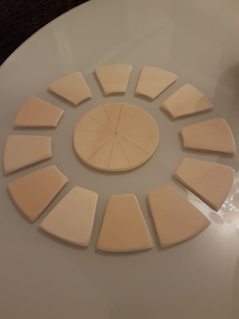 Das Ziffernblatt möchte ich aufsetzen, als Thema habe ich mir Portland/OR ausgesucht. Die Zahlen sollen, genau wie der Mittelkreis, einzeln aufgesetzt sein. Dazu habe ich mir im ersten Schritt mit Zirkel die nötigen Kreise und Striche auf das Holzbrett gezeichnet.