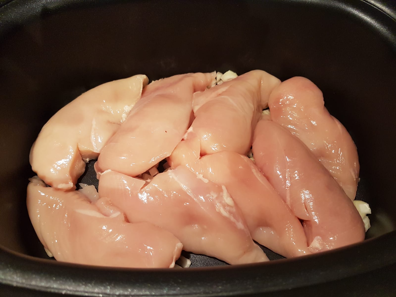 Das Hähnchenfilet in den Slow Cooker legen, die Zwiebeln in dünne Ringe schneiden und auf das Fleisch geben.