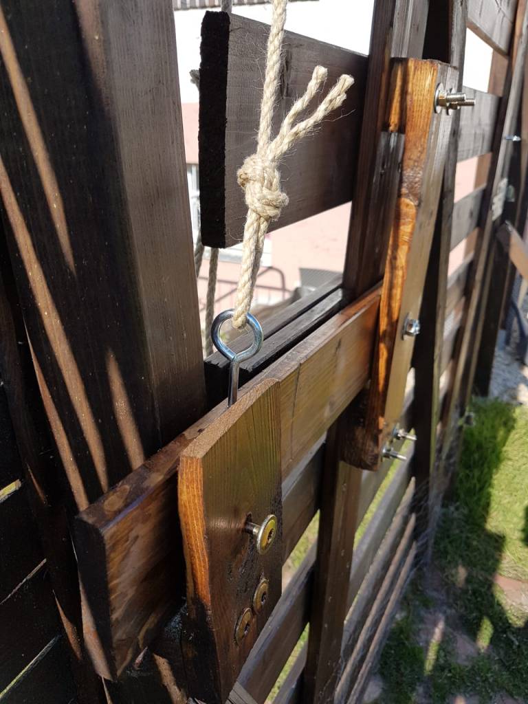 Zudem kann man das Tor jetzt auch von außen öffnen. Natürlich habe ich noch ein Loch durch den Verschluss gebohrt, damit ich innen entscheiden kann, ob es von außen zu öffnen ist.