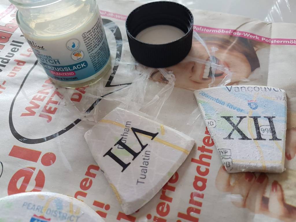 Nachdem die Bilder übertragen wurden, müssen sie noch lackiert werden. Benutze unbedingt den passenden Lack zum Foto Transfer Potch.