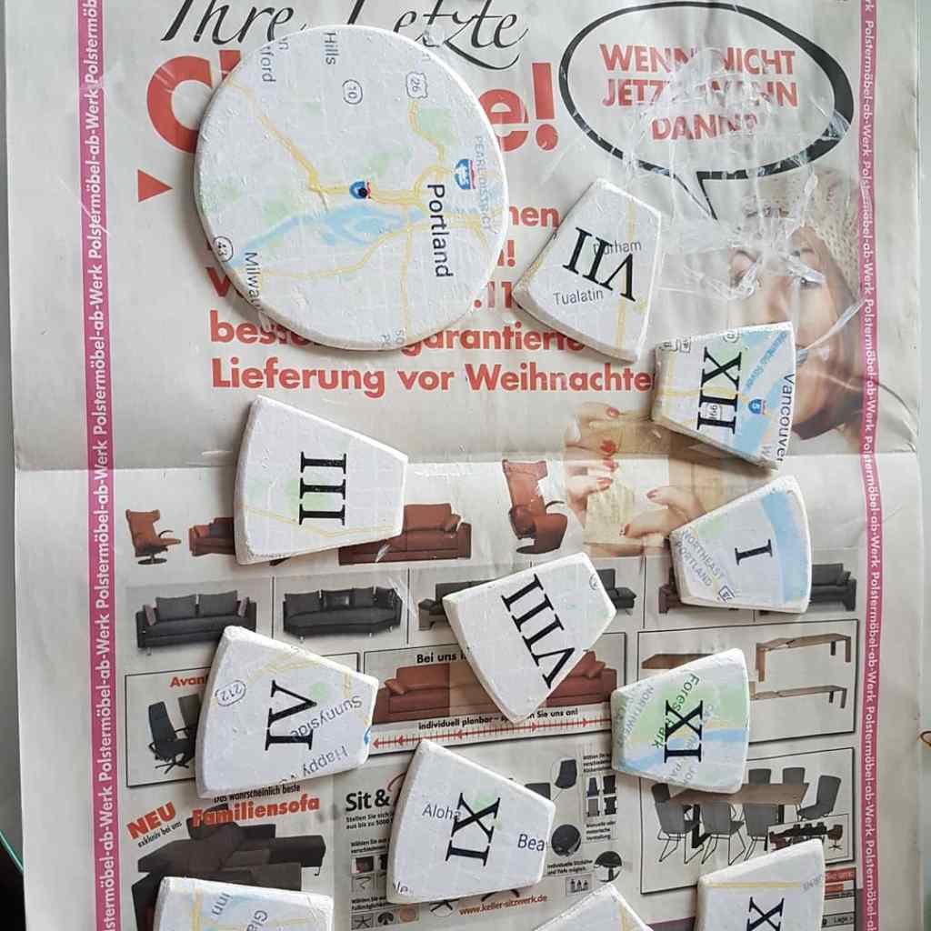 Zusammenbauen. Die Teile müssen ausgerichtet und aufgeklebt werden, ein Geodreieck hilft die Ziffern genau auszurichten. Der Kreis hat 360°. Teilt man 360 durch 12 Ziffern, müssen die Ziffern mit der Mitte alle 30° aufgeklebt werden. Zum Aufkleben nehme ich Heißkleber, da die Oberfläche nicht eben ist und Heißkleber das ganz gut ausgleicht.