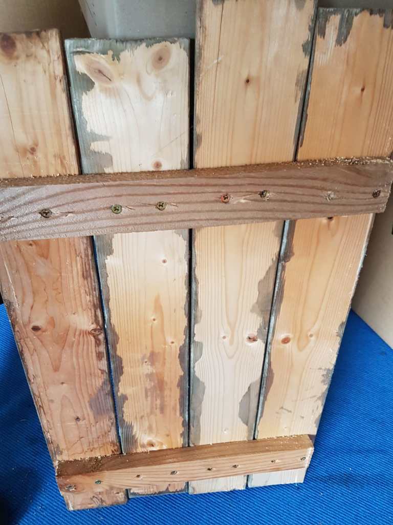 Rechts, so sahen alle Bretter aus. Gekauft im Baumarkt. Zunächst habe ich das Holz behandelt, wie hier im Beitrag beschrieben. Danach kannst du dann verfahren, wie in diesem Beitrag. Aus ein paar Baumarktbrettern entsteht etwas Altes, Antikes. 😉
