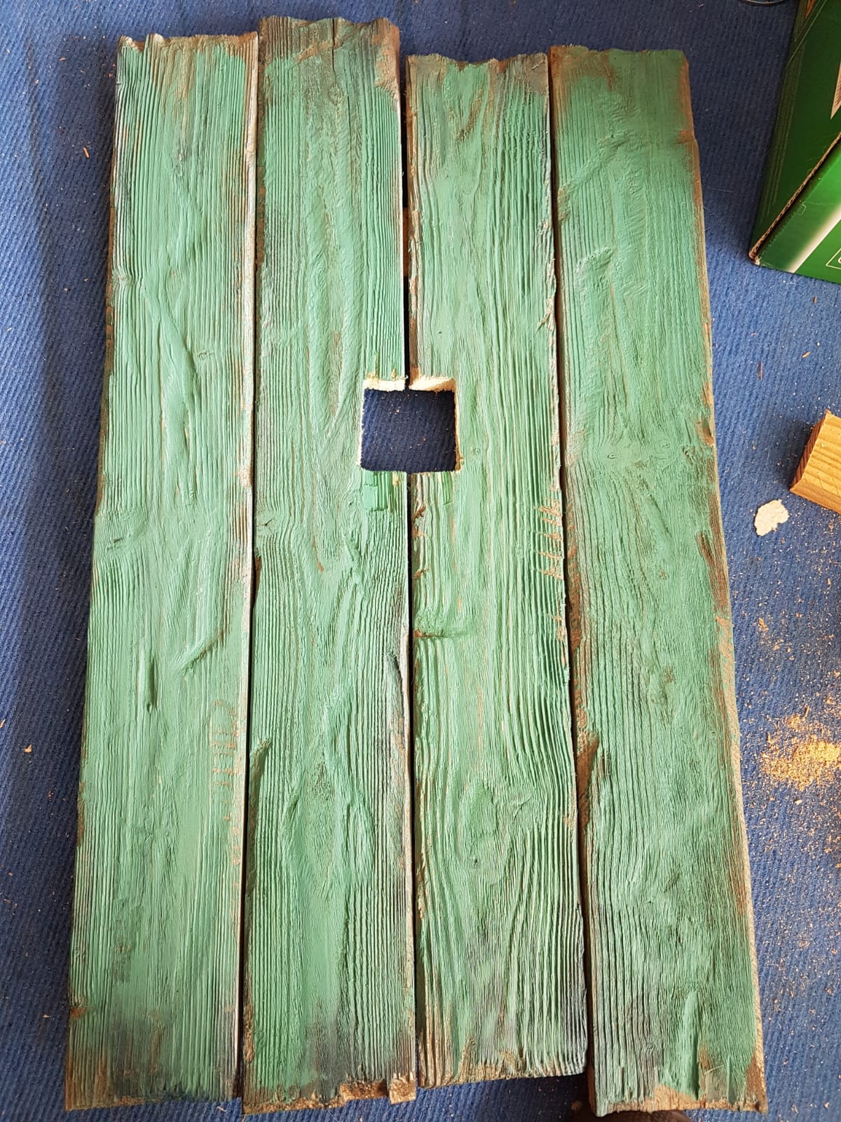 Natürlich hat das mit der Spraydose nicht den Effekt gehabt, den ich haben wollte. Also habe ich die Bretter nochmal neu gestrichen, in einem helleren Ton. Gleicher Anteil Grün und Blau, halbe Menge Weiß und ein kleiner Tropfen Braun.