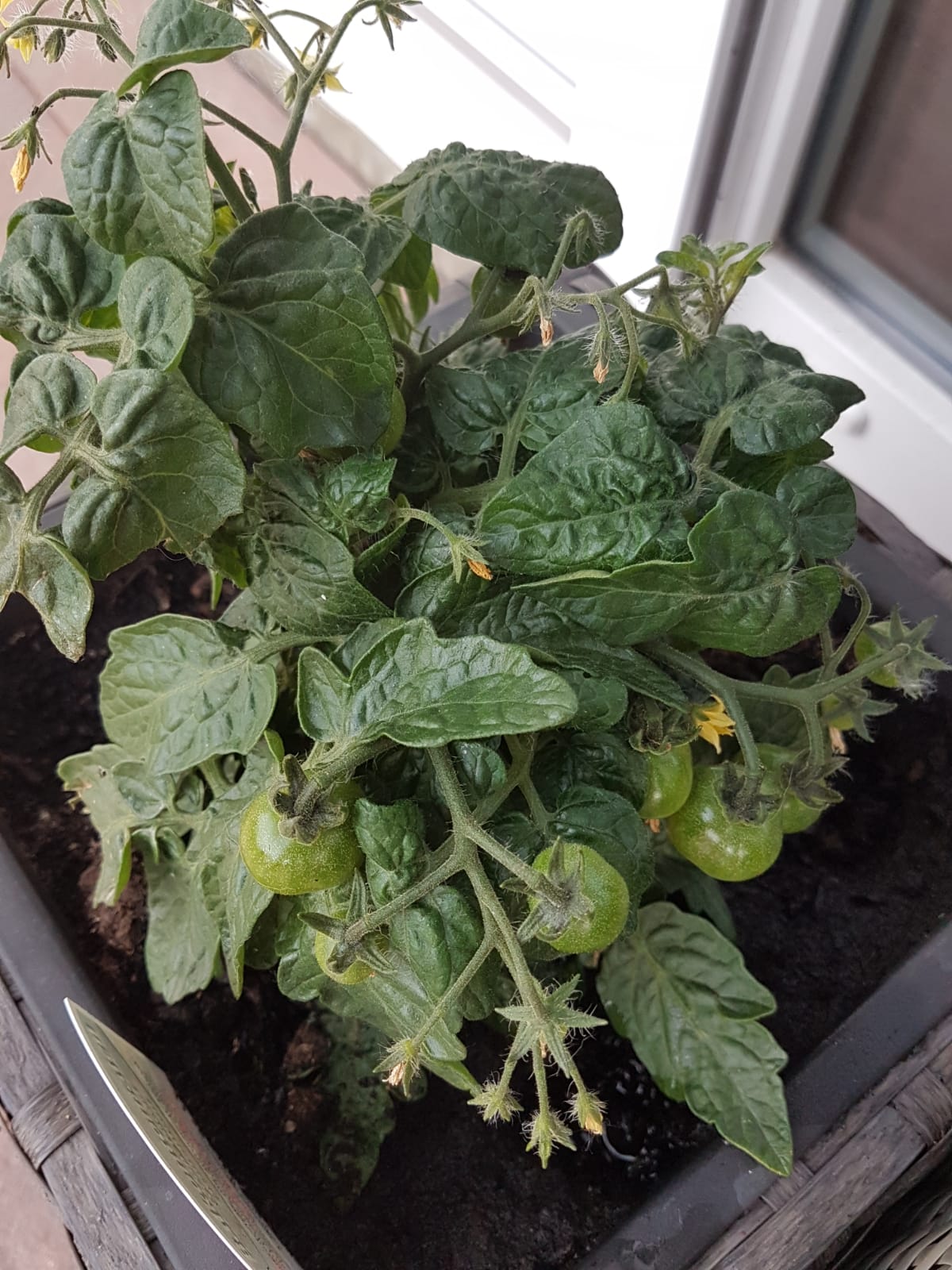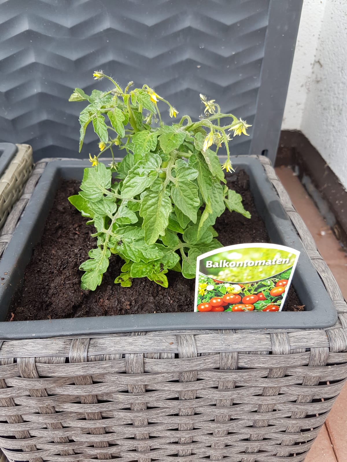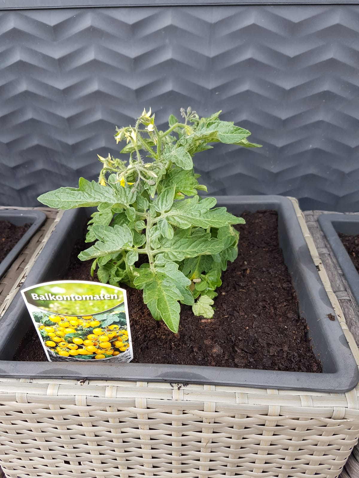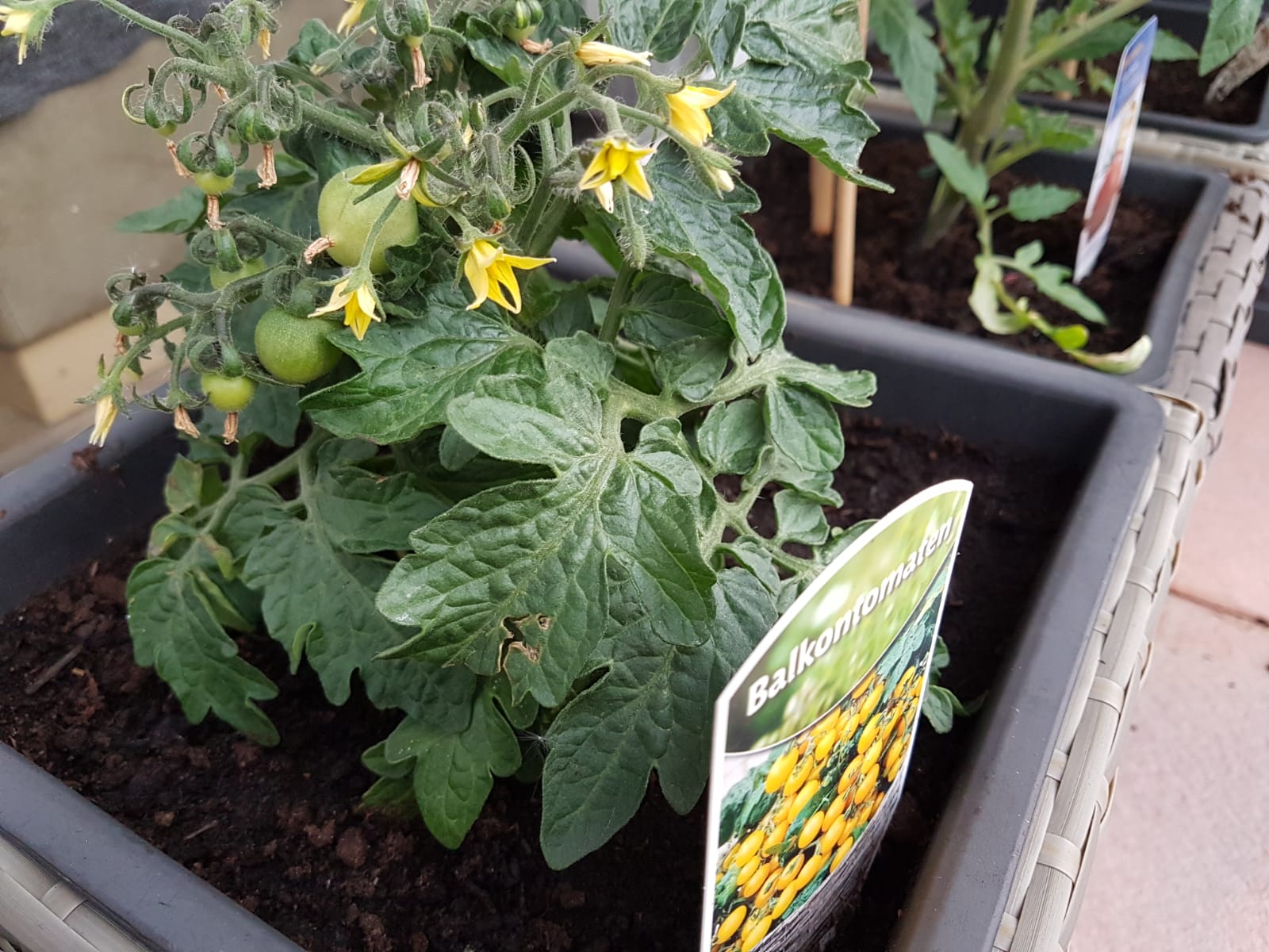 Langsam geht es vorwärts. Die beiden kleinen Pflanzen mit den Minitomaten wachsen und die Früchte werden größer. Die Pflanze mit den gelben Balkontomaten liegt derzeit vorn. Bei den beiden Pflanzen mit den großen Tomaten muss ich die Rankhilfen erweitern, die kommen an ihre Grenzen.