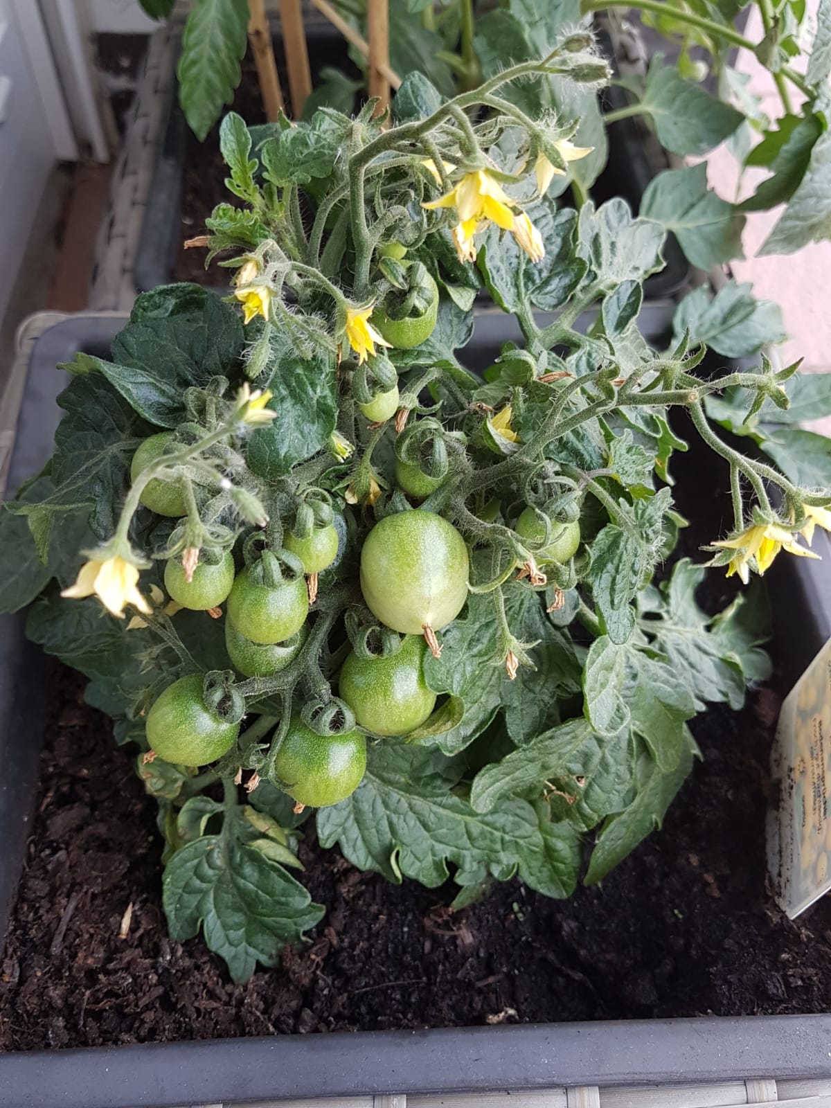Bei den kleinen Tomaten tut sich eine Menge. Viele Tomaten, die immer größer werden und immer neue Blüten. 🙂
