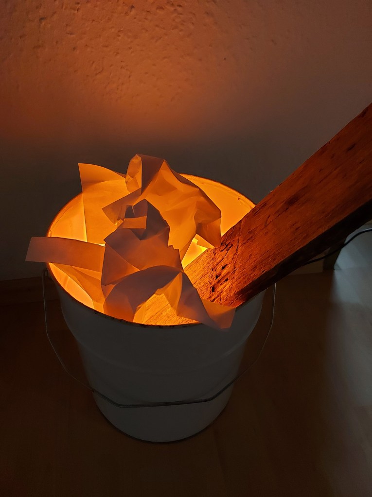 Zum Schluss noch ein bisschen „Abfall“ in der Tonne angeordnet, damit man die Lampe nicht sieht und sich das Licht schön brechen kann. Am Ende ist es dann ein kleines Lagerfeuer in der Wohnung geworden.
