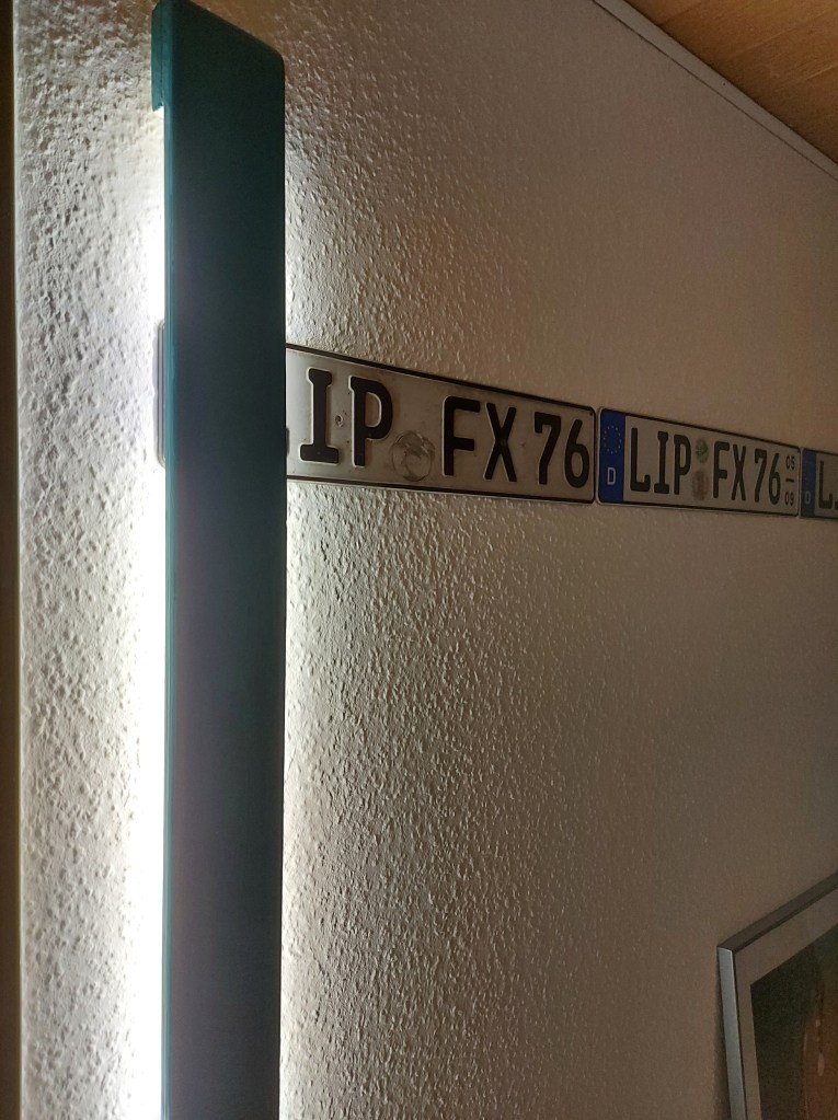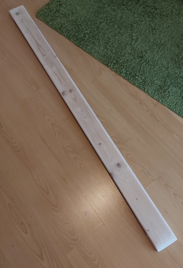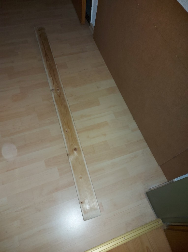 Hier lag noch ein altes Brett herum. 2 Meter lang, 9,5cm breit und 1,9cm dick. Im Flur fehlte noch eine Lampe. Was liegt da näher?